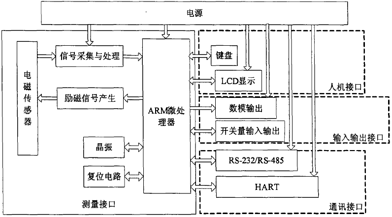 基于ARM的電磁流量計(jì)轉(zhuǎn)換器硬件部分主要由以下幾部分組成(見下圖):輸入輸出接口、流量測量接口、通訊接口和人機(jī)對話接口。輸入輸出接口包括數(shù)模輸出和開關(guān)量輸入輸出;流量測量接口包括信號采集與處理、激勵信號產(chǎn)生和AKM微處理器;通訊接口包括RS-232、RS-485和HART;人機(jī)對話界面包括鍵盤和液晶顯示器。