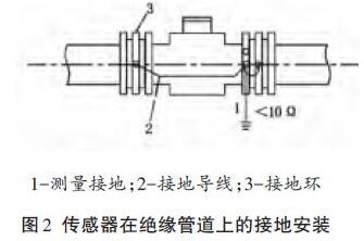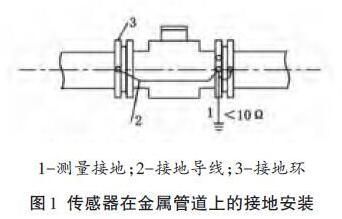 (4) 傳感器安裝在金屬管上,傳感器的接地線可按廠家要求接在管子兩側的法蘭上,形成可靠的接地回路(見圖1) .儀表的接地點應為獨立接地點,不得與其他用電設備的接地線連接。